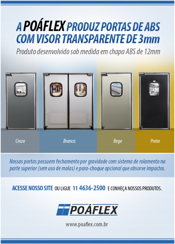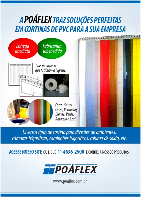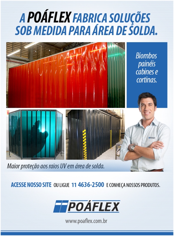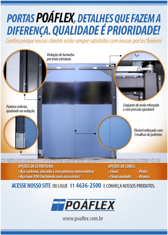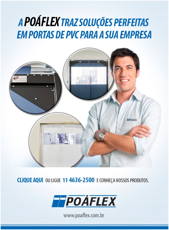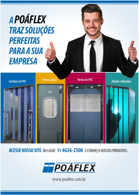 oáflex sempre de portas abertas para a sua empresa. Somos pioneiros no mercado, fundada em 1998, com décadas de atuação, trabalha empregando o conhecimento de profissionais com mais de 30 anos de mercado e conta com a mais avançada tecnologia para a produção de seus produtos. A Poáflex analisa as necessidades específicas de cada cliente, para indicar e elaborar, sob medida, as mais confiáveis alternativas em portas, cortinas, painéis, biombos de segurança, cabines e fechamento de área. A Poáflex tem como base servir o cliente de forma eficiente, e isto se constitui em um padrão em termos de qualidade, confiabilidade e rapidez. A empresa conta com uma equipe própria de instaladores, treinados e supervisionados por técnicos responsáveis e experientes. Disponibiliza, também, equipamentos da mais alta tecnologia, em conformidade com todas as normas técnicas e de segurança do trabalho. Temos nos destacado no mercado, por tudo isso, pela qualidade de nossos produtos e serviços e principalmente pelo ótimo atendimento que sempre dedicamos à nossos clientes. Poaflex, transformando clientes em parceiros e amigos!